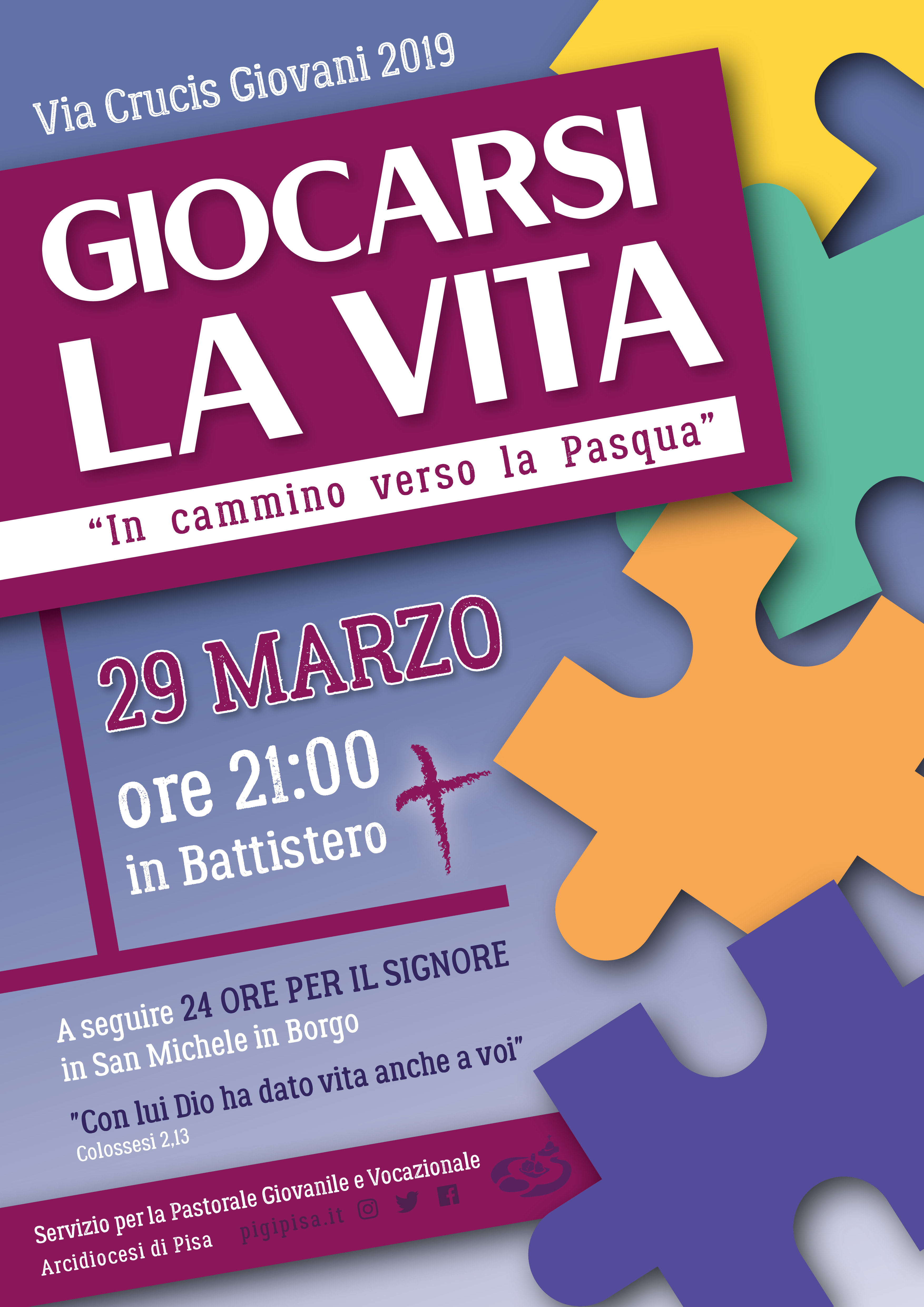 Via Crucis Giovani 2019 29 Marzo ore 21:00 in Battistero A seguire 24 Ore per il Signore in San Michele in Borgo “Con lui Dio ha dato vita anche a voi” Colossesi 2,13